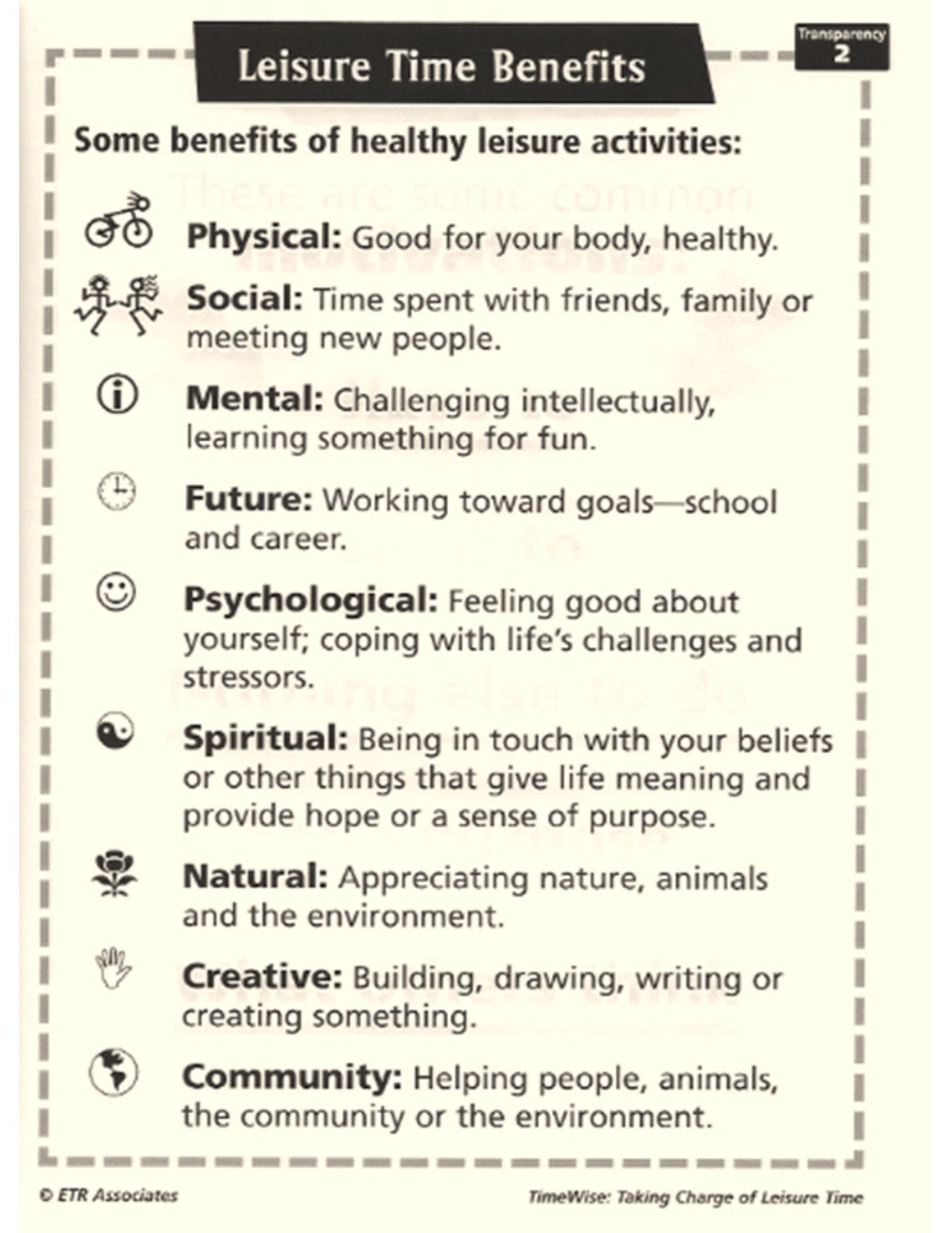 - Leisure Time Benefits (Transparency 2, Teacher Manual)