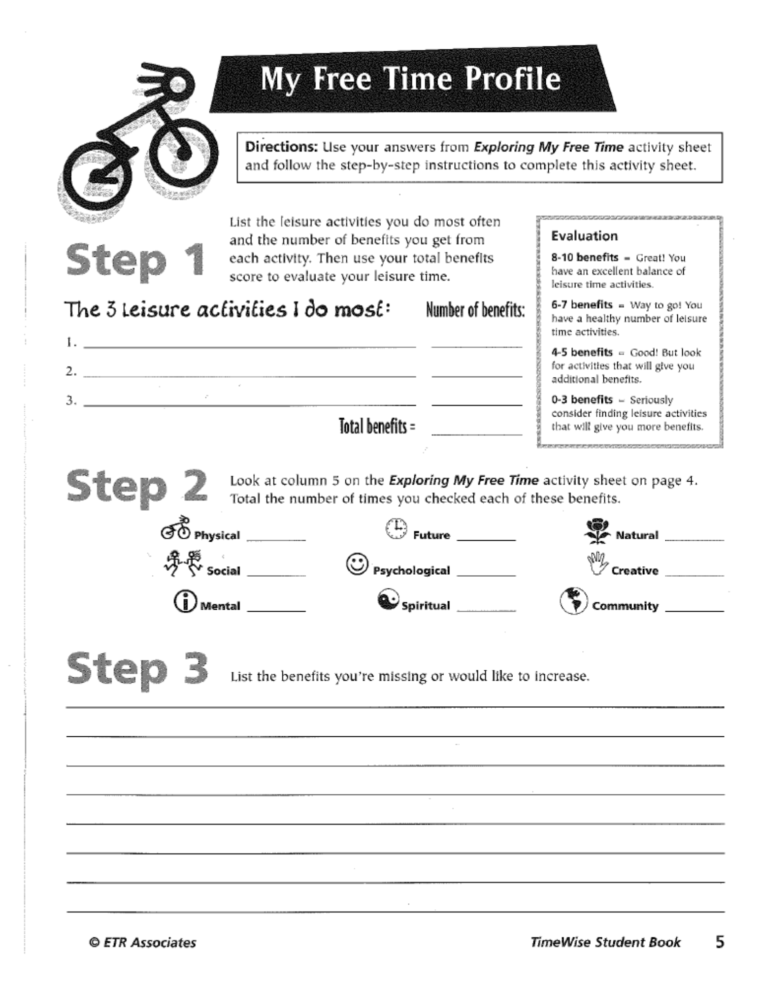 TimeWise2 activities focus on how to get the most benefits from your leisure time. There are many possible benefits of healthy leisure activities.
