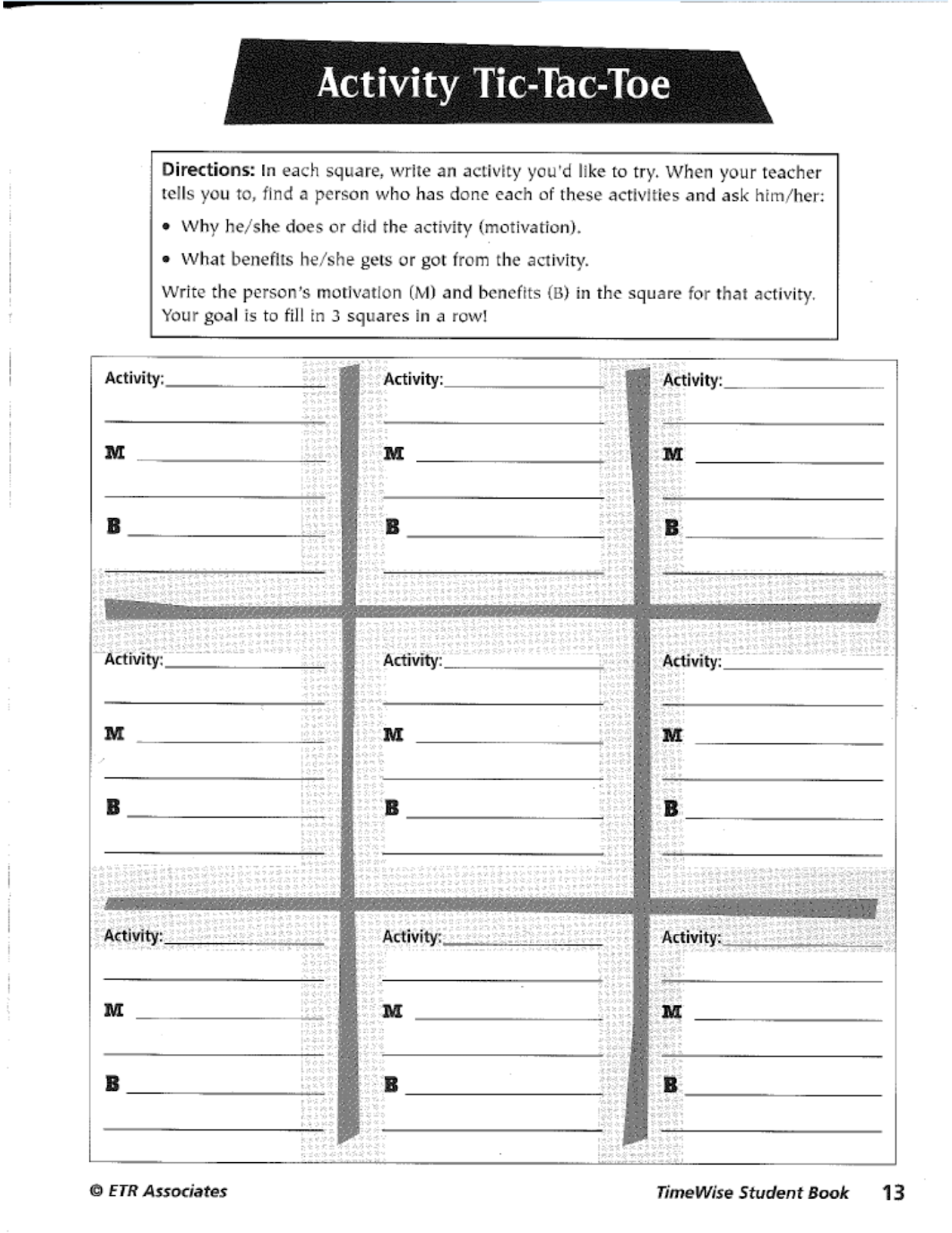 - On the first line of each square on the Tic-Tac-Toe sheet, students are to write down activities that they have never tried but would like to. These should be realistic choices that they may actually be able to do. If the students cannot think of 9 new activities, they can list things they already do.