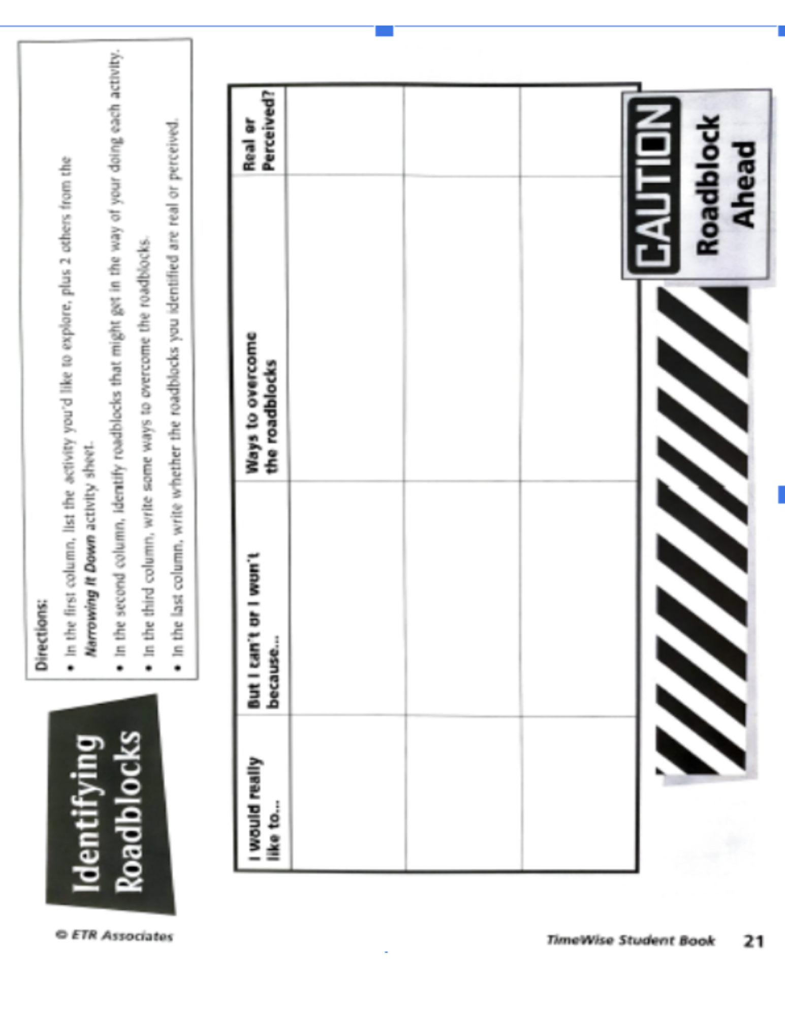 - Complete Identifying Roadblocks Worksheet and Discuss Real and Perceived Roadblocks