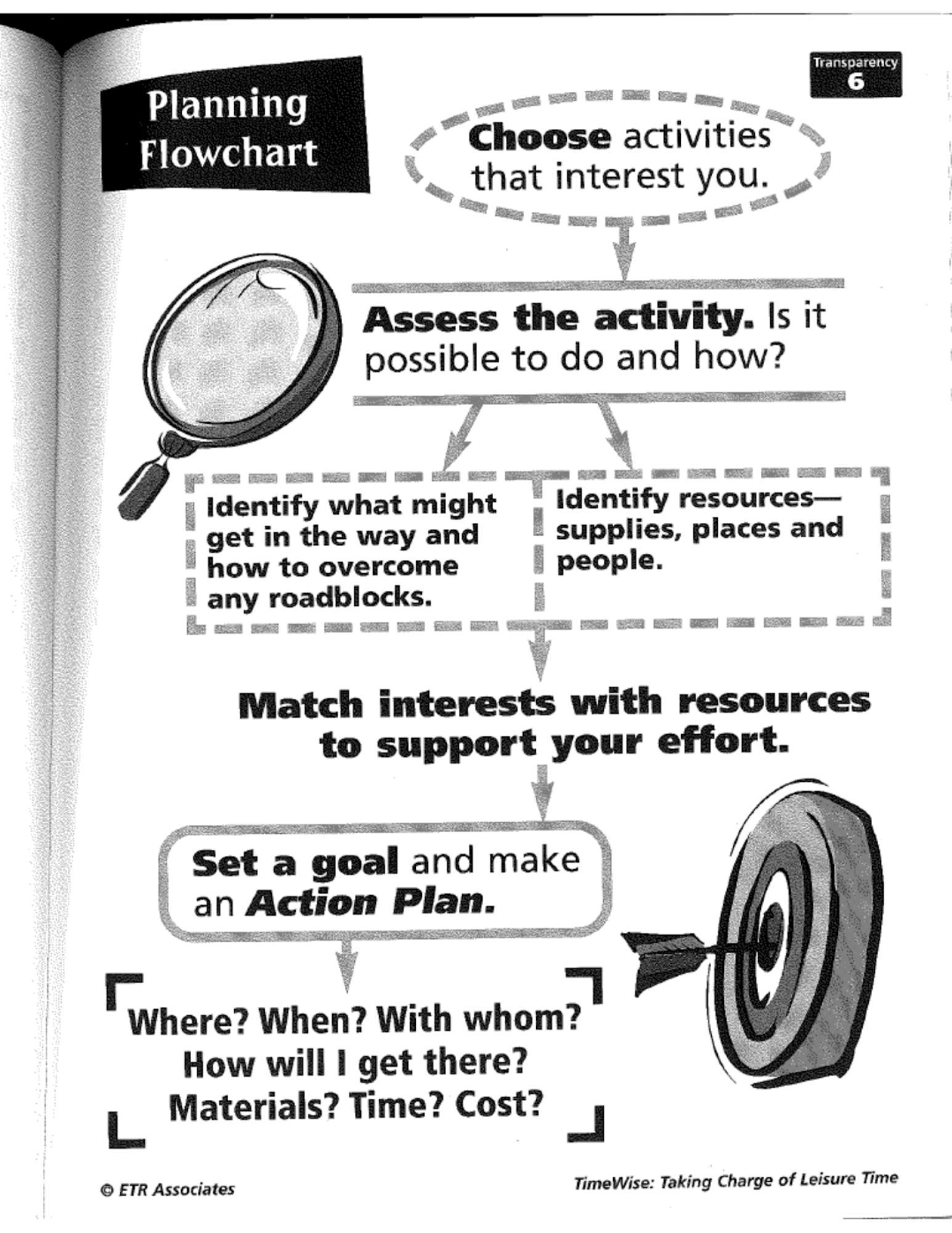 Students will learn how to make an action plan to participate in desired activities. This lesson also helps students identify potential constraints that might get in the way of engaging in desired leisure interests and whether they are real barriers or whether there are ways to overcome the perceived constraints.