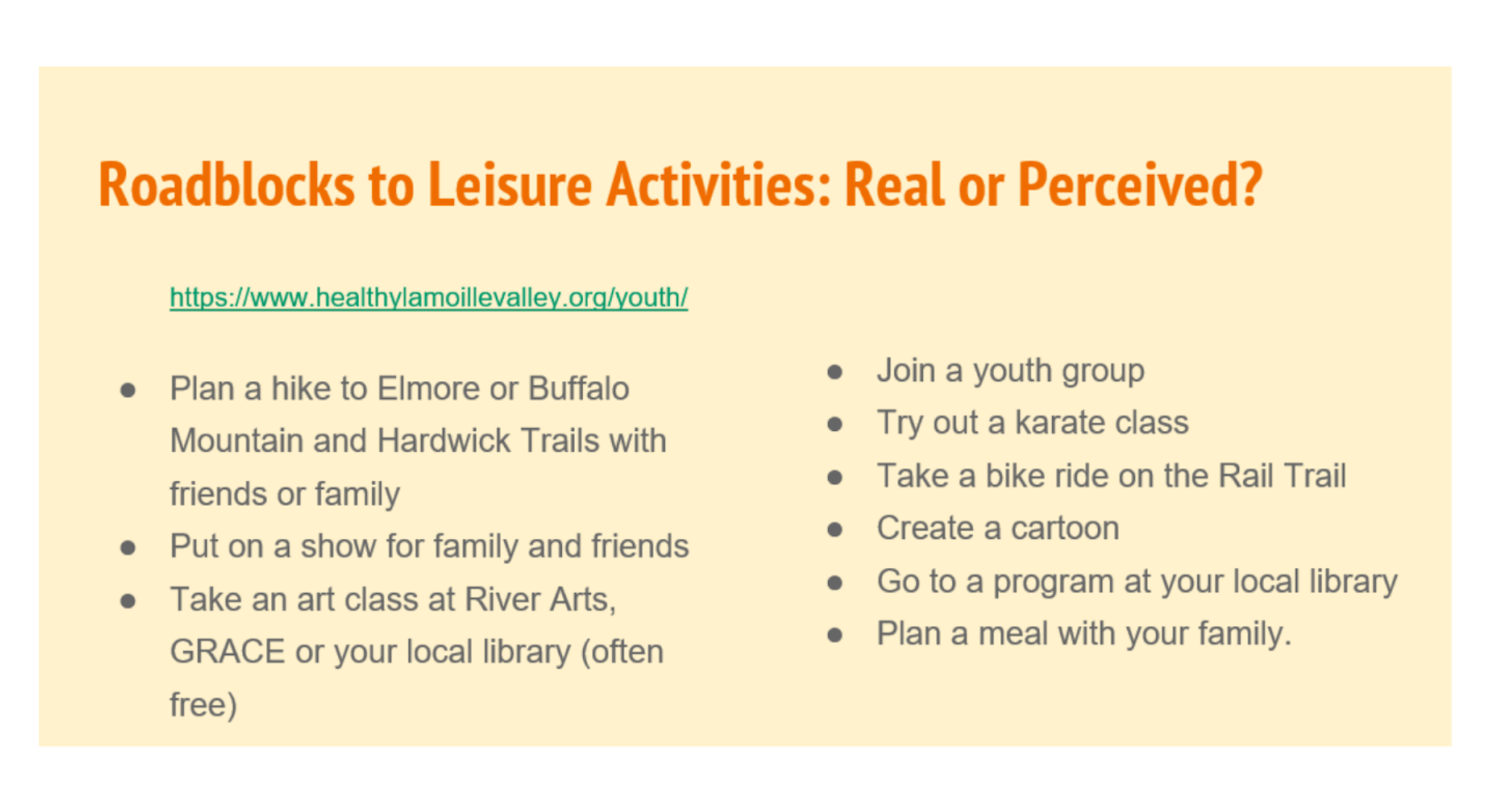 Let’s choose a few of these and discuss what obstacles might get in the way of pursuing the activity and whether the roadblock can be overcome.