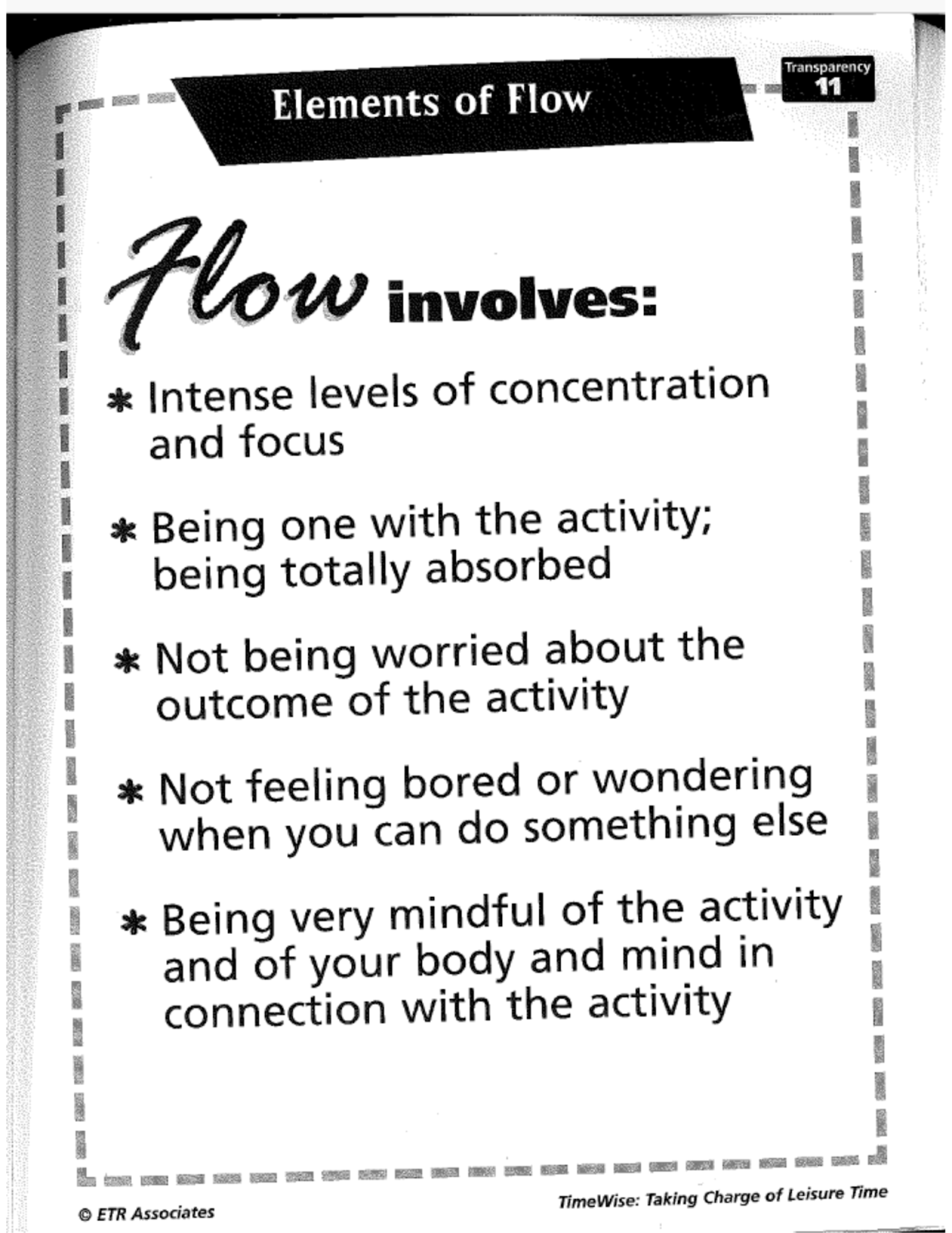 Often when we do activities on the bottom rungs of the pyramid, we tend to “get in the zone” or experience “flow.” Flow is a concept to describe what we feel when we are very immersed in what we are doing and are having a very positive and enjoyable experience. Flow activities contribute to our overall health and wellbeing.