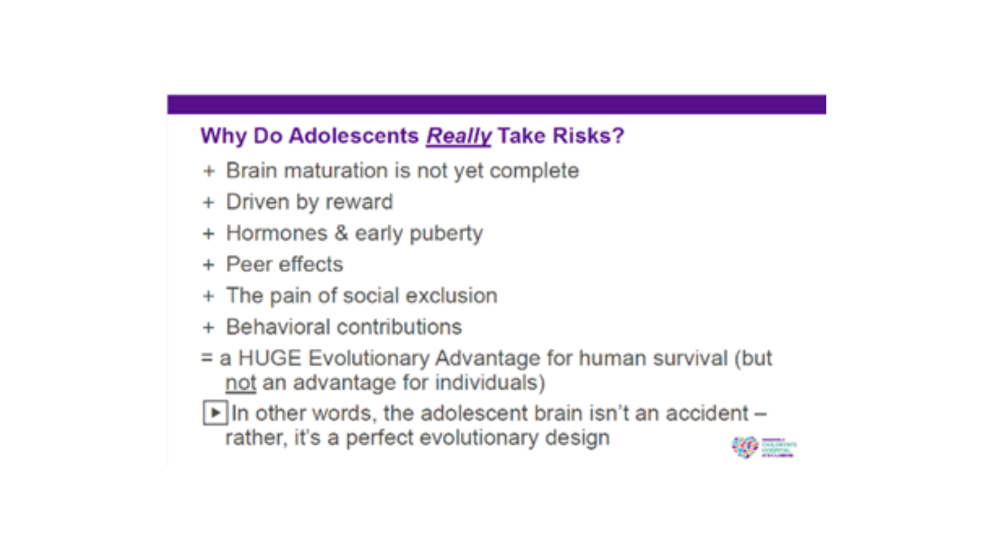Adolescents understand the concept of risk. They typically don’t underestimate risk, they tend to overestimate. But they generally have an optimistic bias, thinking they protect themselves more than their peers.